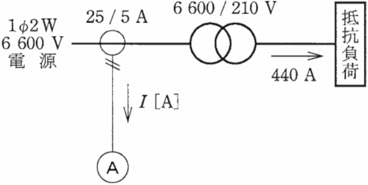 図のように, 変圧比が6600/210 Vの単相変圧器の二次側に抵抗負荷が接続され,その負荷電流は440 Aであった。このとき,変圧器の一次側に設置された変流器の二次側に流れる電流I[A]は。