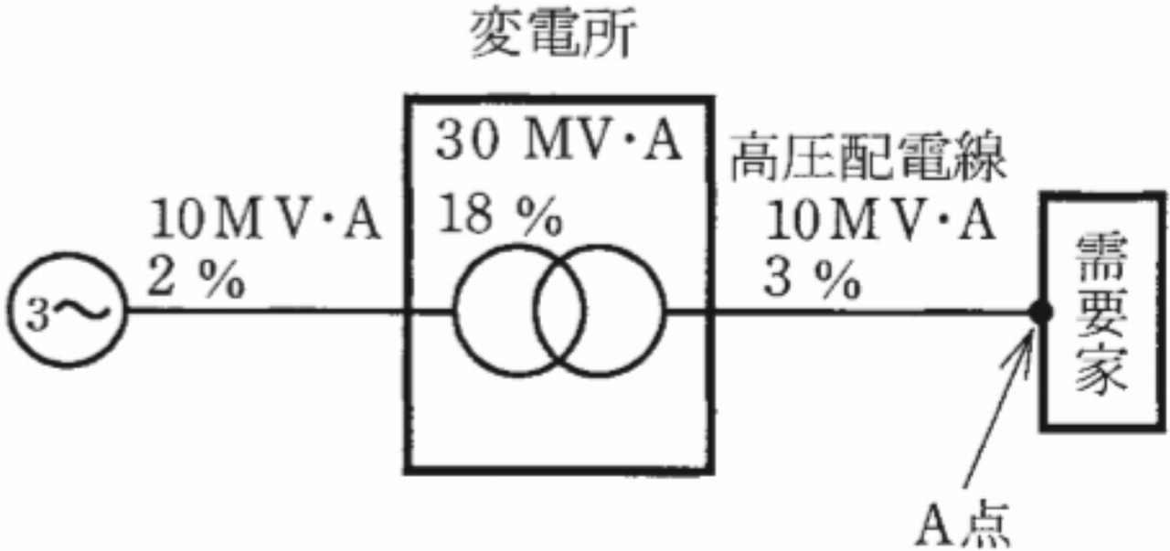 図のように,配電用変電所の変圧器の百分率インピーダンスが基準容量30 MV・Aで18%, 変電所から電源側の百分率インピーダンスが 基準容量10 MV・Aで2%, 高圧配電線の百分率インピーダンスが基準容量10 MV・Aで 3%である。高圧需要家の受電点(A点) から電源側の合成百分率インピーダンスは 基準容量10 MV・Aでいくらか。